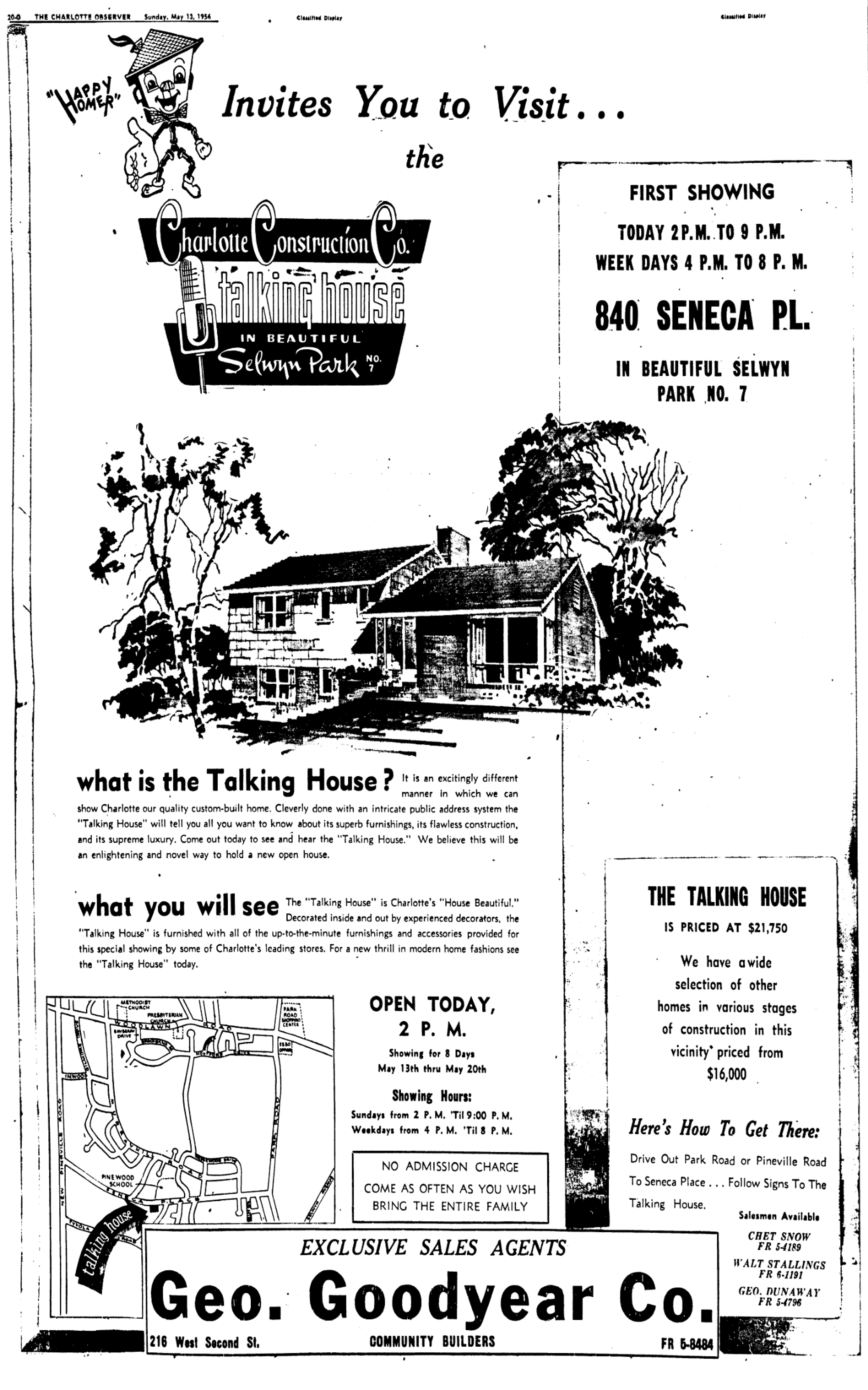 The Talking House became a regular exhibition over the next several years. George Goodyear built the next iteration in 1956 at 840 Seneca Place in Selwyn Park, which was visited by over 33,000 during eight days in May. Goodyear enlisted frequent collaborators architect R. Emory Holroyd, Jr. to design the house and Charles B. Martin of Charlotte Construction Company to erect it. Local media personalities voiced the Talking House–Fred Dickson and Dick Curley of WSOC, Fred Knight of WIST, and Gordon Golding and Harry McConnell of the Charlotte Observer.
